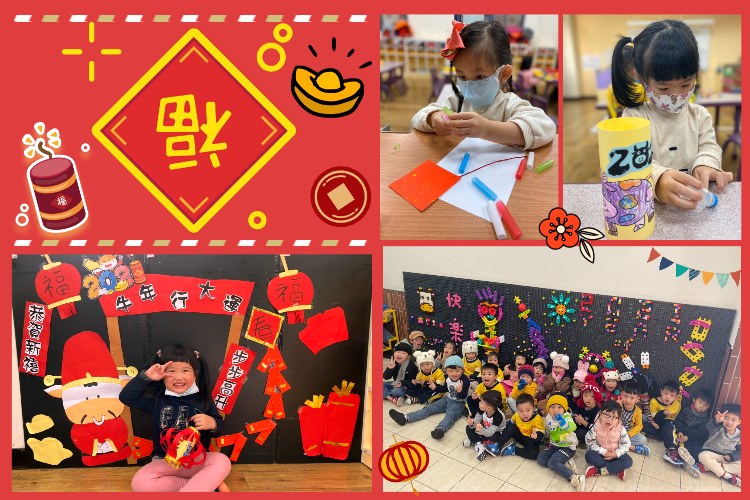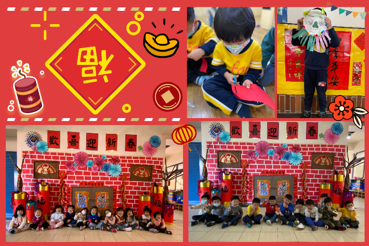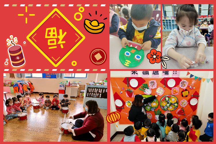 以年節為主題的課程活動,學習說出祝福的吉祥話,手作"元寶"剪"窗花"、"舞龍舞獅"、"水墨梅花創意畫"、"揮毫寫春聯"、"聽年獸的取故事"